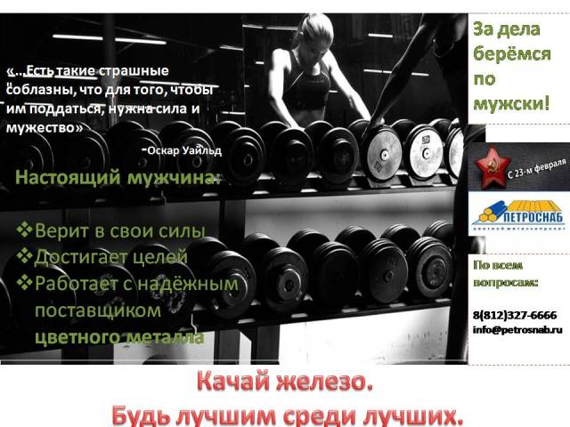 Раздел:  Цветной металлопрокат, МЕДНЫЙ АНОД, БРОНЗОВЫЙ ПРУТОК, АЛЮМИНИЕВЫЙ УГОЛОК, ЛАТУННЫЙ КРУГ, ПРУТОК ДЮРАЛЕВЫЙ, БАББИТ б83, ТРУБА ПРОФИЛЬНАЯ, ПЛОМБЫ СВИНЦОВЫЕ, КУПИТЬ НЕРЖАВЕЙКУ / Новости / Новости компании / ООО"ПЕТРОСНАБ" поздравляет мужчин! 23.02.2014